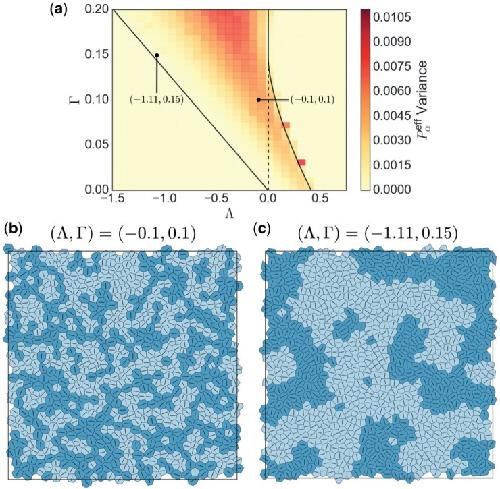 Fig. 8. Visualizing the effect of peripheral stress on network packing geometry. 800 cells were simulated in boxes of width , lower mean circularity and greater variability. (Colour in online.) |