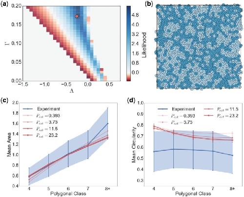 Fig. 9. Results of parameter fitting. (a) Heat map showing value of the likelihood function (4.1) across a uniform grid in valid parameter space. The simulated monolayers used were the same as those in Figs 6 and 7. For each monolayer, the mean areas per polygonal class were calculated and used to evaluate (4.1). The likelihood was maximized at \documentclass[12pt]{minimal} \usepackage{amsmath} \usepackage{wasysym} \usepackage{amsfonts} \usepackage{amssymb} \usepackage{amsbsy} \usepackage{upgreek} \usepackage{mathrsfs} \setlength{\oddsidemargin}{-69pt} \begin{document} }{}$(\Lambda, \Gamma)\approx (-0.26, 0.17)$\end{document}, marked by the circular symbol; a corresponding monolayer is shown in (b), with cells having \documentclass[12pt]{minimal} \usepackage{amsmath} \usepackage{wasysym} \usepackage{amsfonts} \usepackage{amssymb} \usepackage{amsbsy} \usepackage{upgreek} \usepackage{mathrsfs} \setlength{\oddsidemargin}{-69pt} \begin{document} }{}$P_\alpha^{\text{eff}}>0$\end{document} (\documentclass[12pt]{minimal} \usepackage{amsmath} \usepackage{wasysym} \usepackage{amsfonts} \usepackage{amssymb} \usepackage{amsbsy} \usepackage{upgreek} \usepackage{mathrsfs} \setlength{\oddsidemargin}{-69pt} \begin{document} }{}$<0$\end{document}) shaded dark (light). (c, d) Distributions of area and circularity across polygonal classes for simulations with \documentclass[12pt]{minimal} \usepackage{amsmath} \usepackage{wasysym} \usepackage{amsfonts} \usepackage{amssymb} \usepackage{amsbsy} \usepackage{upgreek} \usepackage{mathrsfs} \setlength{\oddsidemargin}{-69pt} \begin{document} }{}$(\Lambda^\dagger,\Gamma^\dagger)=(-0.259,0.172)$\end{document} for increasing values of \documentclass[12pt]{minimal} \usepackage{amsmath} \usepackage{wasysym} \usepackage{amsfonts} \usepackage{amssymb} \usepackage{amsbsy} \usepackage{upgreek} \usepackage{mathrsfs} \setlength{\oddsidemargin}{-69pt} \begin{document} }{}$P_{\mathrm{ext}}$\end{document}. (Colour in online.) |