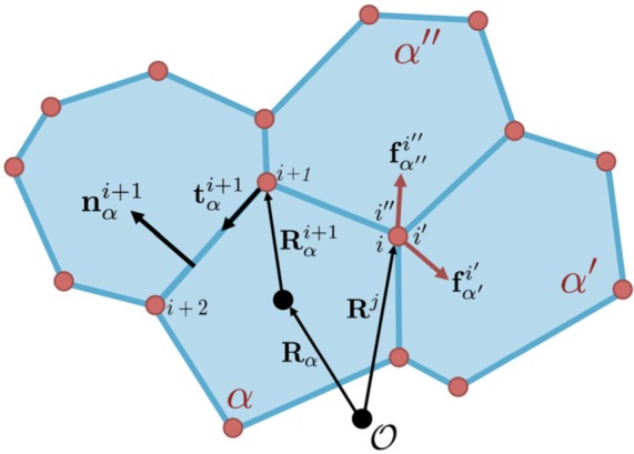 Fig. 2. Representation of disordered cell geometry. Cell \documentclass[12pt]{minimal} \usepackage{amsmath} \usepackage{wasysym} \usepackage{amsfonts} \usepackage{amssymb} \usepackage{amsbsy} \usepackage{upgreek} \usepackage{mathrsfs} \setlength{\oddsidemargin}{-69pt} \begin{document} }{}$\alpha$\end{document} has its centroid at \documentclass[12pt]{minimal} \usepackage{amsmath} \usepackage{wasysym} \usepackage{amsfonts} \usepackage{amssymb} \usepackage{amsbsy} \usepackage{upgreek} \usepackage{mathrsfs} \setlength{\oddsidemargin}{-69pt} \begin{document} }{}$\mathbf{R}_{\alpha}$\end{document} relative to a fixed origin, \documentclass[12pt]{minimal} \usepackage{amsmath} \usepackage{wasysym} \usepackage{amsfonts} \usepackage{amssymb} \usepackage{amsbsy} \usepackage{upgreek} \usepackage{mathrsfs} \setlength{\oddsidemargin}{-69pt} \begin{document} }{}$\mathscr{O}$\end{document}. The position of vertex \documentclass[12pt]{minimal} \usepackage{amsmath} \usepackage{wasysym} \usepackage{amsfonts} \usepackage{amssymb} \usepackage{amsbsy} \usepackage{upgreek} \usepackage{mathrsfs} \setlength{\oddsidemargin}{-69pt} \begin{document} }{}$i$\end{document} of cell \documentclass[12pt]{minimal} \usepackage{amsmath} \usepackage{wasysym} \usepackage{amsfonts} \usepackage{amssymb} \usepackage{amsbsy} \usepackage{upgreek} \usepackage{mathrsfs} \setlength{\oddsidemargin}{-69pt} \begin{document} }{}$\alpha$\end{document} is given equivalently via \documentclass[12pt]{minimal} \usepackage{amsmath} \usepackage{wasysym} \usepackage{amsfonts} \usepackage{amssymb} \usepackage{amsbsy} \usepackage{upgreek} \usepackage{mathrsfs} \setlength{\oddsidemargin}{-69pt} \begin{document} }{}$\mathbf{R}^{i}_{\alpha}$\end{document}, relative to the centroid, or \documentclass[12pt]{minimal} \usepackage{amsmath} \usepackage{wasysym} \usepackage{amsfonts} \usepackage{amssymb} \usepackage{amsbsy} \usepackage{upgreek} \usepackage{mathrsfs} \setlength{\oddsidemargin}{-69pt} \begin{document} }{}$\mathbf{R}^{j}$\end{document}, relative to \documentclass[12pt]{minimal} \usepackage{amsmath} \usepackage{wasysym} \usepackage{amsfonts} \usepackage{amssymb} \usepackage{amsbsy} \usepackage{upgreek} \usepackage{mathrsfs} \setlength{\oddsidemargin}{-69pt} \begin{document} }{}$\mathscr{O}$\end{document}. For a vertex (trijunction) at \documentclass[12pt]{minimal} \usepackage{amsmath} \usepackage{wasysym} \usepackage{amsfonts} \usepackage{amssymb} \usepackage{amsbsy} \usepackage{upgreek} \usepackage{mathrsfs} \setlength{\oddsidemargin}{-69pt} \begin{document} }{}$\mathbf{R}^{j}$\end{document}, there exist three vectors, \documentclass[12pt]{minimal} \usepackage{amsmath} \usepackage{wasysym} \usepackage{amsfonts} \usepackage{amssymb} \usepackage{amsbsy} \usepackage{upgreek} \usepackage{mathrsfs} \setlength{\oddsidemargin}{-69pt} \begin{document} }{}$\mathbf{R}^{i}_{\alpha}, \mathbf{R}^{i^{\prime}}_{\alpha^{\prime}}, \mathbf{R}^{i^{\prime\prime}}_{\alpha^{\prime\prime}}$\end{document} for cells, \documentclass[12pt]{minimal} \usepackage{amsmath} \usepackage{wasysym} \usepackage{amsfonts} \usepackage{amssymb} \usepackage{amsbsy} \usepackage{upgreek} \usepackage{mathrsfs} \setlength{\oddsidemargin}{-69pt} \begin{document} }{}$\alpha, \alpha^{\prime}, \alpha^{\prime\prime}$\end{document}, pointing to the same vertex. Cell properties, such as area and tangents along edges, are defined relative to the cell centroid. (Colour in online.) |