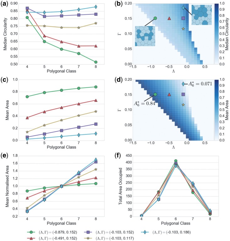 Fig. 7. Dependence of cell geometry on model parameters, using five unique simulations with 800 cells (4000 cells total) in a periodic box under zero net external pressure. (a) Mean circularity of cells per polygonal class, at parameter values indicated by corresponding symbols in -parameter space. (e) Mean cell area per polygonal class for given parameters, normalised by the mean area of hexagons. (f) Total area of all cells in each polygonal class, such that the sum of all points equals the area of the box. (Colour in online.) |