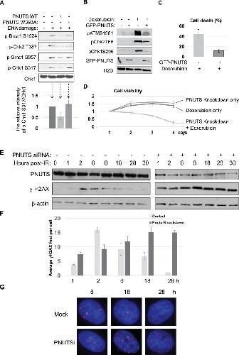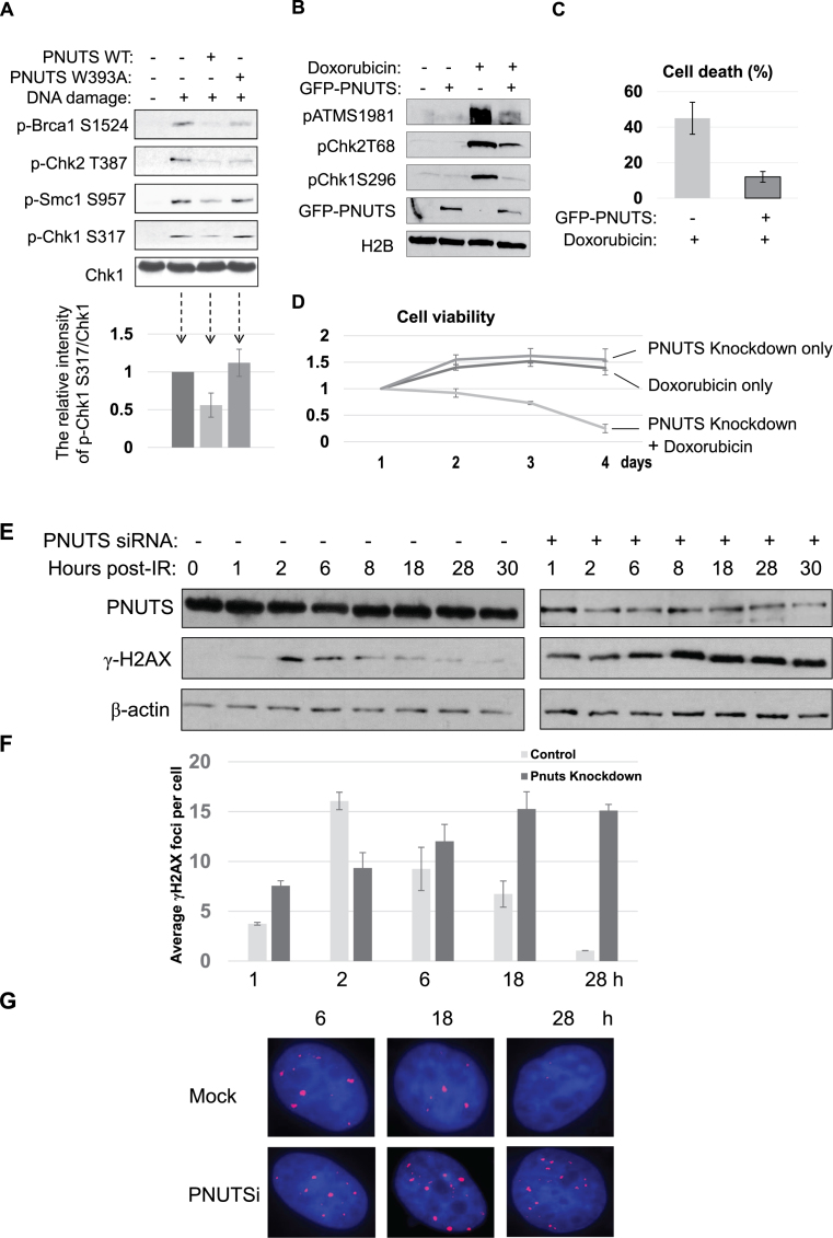 Figure 4. PNUTS mediates the DNA damage response and repair. (A) Xenopus egg extracts were supplemented with (dA-dT)70 (DNA damage), WT or W393A PNUTS, as indicated, and incubated for 30 min. The extract samples were analyzed by immunoblotting for Brca1 phospho-S1524, Chk2 phospho-T387, Smc1 phospho-S957, Chk1 phospho-S317 and Chk1. In the lower panel, the relative intensity of Chk1 phospho-S317/Chk1 was measured using NIH ImageJ, and shown by the mean values and standard deviations. (B) HeLa cells were transfected with GFP-PNUTS, and treated with 5 μM doxorubicin for 4 h, as indicated. The cell lysates were analyzed by immunoblotting for ATM phospho-S1981, Chk2 phospho-T68, Chk1 phoshpo-S296, GFP and H2B. (C) HeLa cells with or without GFP-PNUTS expression were treated with doxorubicin for 24 h. Cell death was measured by trypan blue excursion. (D) HeLa cells were treated with PNUTS siRNA and doxorubicin, as indicated. The cell number of each day was normalized to that of the first day for the relative cell viability. (E) HeLa cells with control or PNUTS siRNA were irradiated with 4 Gy IR and incubated as indicated. The cell lysates were analyzed by immunoblotting for γ-H2AX, PNUTS and β-actin. (F, G) HeLa cells treated as in panel E were examined by immunofluorescence for γ-H2AX. The average numbers of γ-H2AX foci were counted (F) and representative images of cells stained for γ-H2AX (in red) and DAPI (in blue) are shown (G). At least 100 cells were analyzed for γ-H2AX foci in panel F. |