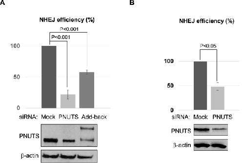 Figure 5. PNUTS is required for NHEJ in Xenopus egg extract and human cells. (A) As described in Materials and Methods, HeLa cells were treated with control (Ctr) or PNUTS siRNA, or with PNUTS siRNA and then reconstituted with siRNA resistant GFP-PNUTS (Add-back). NHEJ assay was performed using a GFP-expressing template linearized with Nhe1, as described in Material and Methods. The repair efficiency, measured by GFP expression, is shown. The cell lysates were analyzed by immunoblotting for PNUTS and β-actin. (B) The chromosomal NHEJ reporter cells were transfected with control or PNUTS siRNA. The cell lysates were analyzed by immunoblotting for PNUTS and β-actin. The chromosomal NHEJ assay was performed as in Figure 2C. The repair efficiency, measured by GFP expression, is shown. A minimum of three experiments were carried out in the above panels, and the results are shown as the mean values and standard deviations. Statistical significance was analyzed using an unpaired two-tailed Student's t-test. |