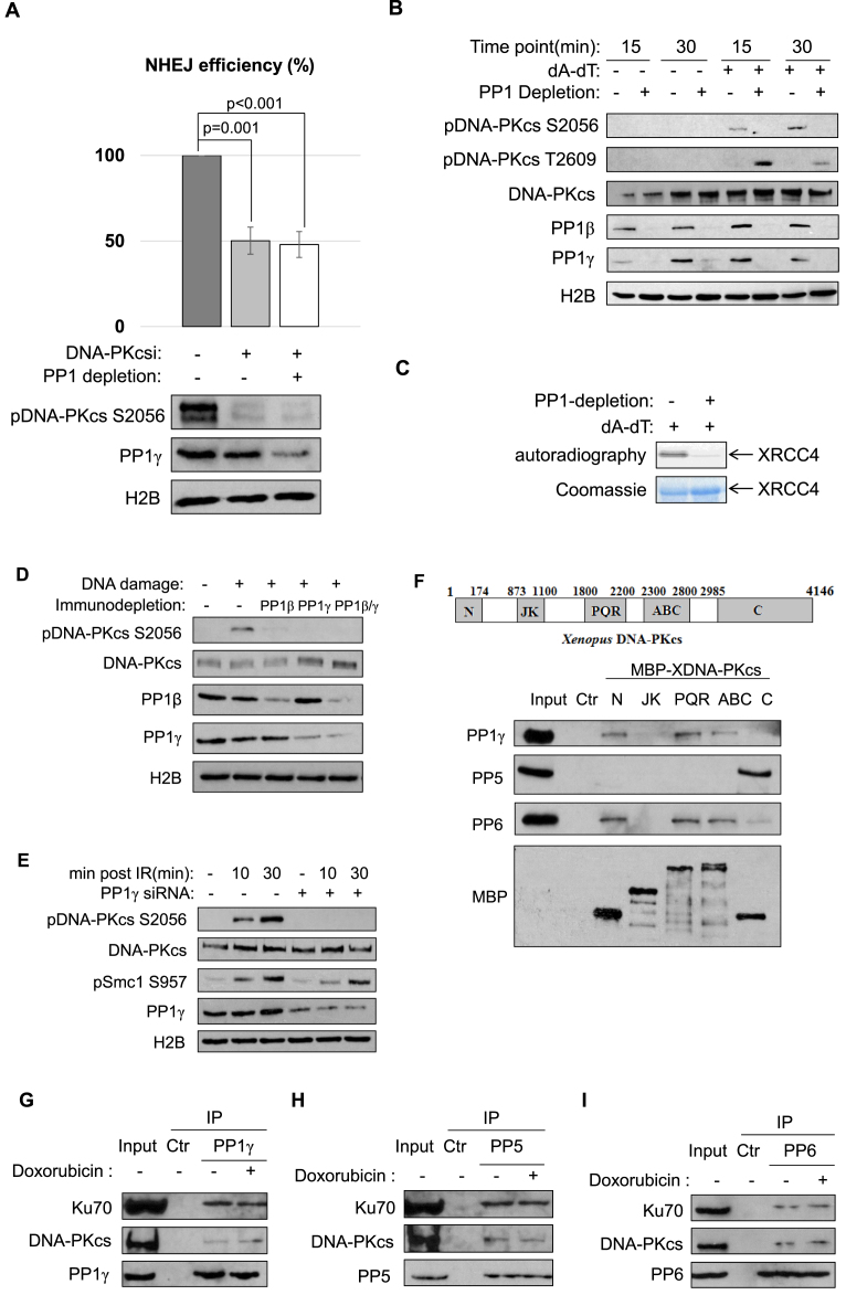 Figure 3. PP1 functions in NHEJ via regulation of DNA-PKcs. (A) The linearized NHEJ template was repaired in Xenopus egg extracts, as in Figure 2B. The extracts were depleted of PP1 (using the PP-binding motif of PNUTS, as in Figure 2A), or treated with a DNA-PKcs inhibitor (NU7441, 20 uM), as indicated. The repair efficiency, measured by colony formation, is shown. Extract samples were analyzed by immunoblotting for DNA-PKcs phospho-S2056, PP1γ and H2B. The experiment was performed at least three times, and the results are shown as the mean values and standard deviations. Statistical significance was analyzed using an unpaired two-tailed Student's t-test. (B) Xenopus egg extracts with or without PP1 depletion (using the PP-binding motif of PNUTS) were treated with 20 ng/μl of (dA-dT)70 as indicated. Immunoblots of DNA-PKcs phospho-S2056, DNA-PKcs phospho-T2609, DNA-PKcs, PP1β, PP1γ and H2B are shown. (C) In vitro DNA-PKcs kinase assay was performed using XRCC4 as substrate, as described in Materials and Methods. The autoradiography and Coomassie stain of XRCC4 are shown. (D) Xenopus egg extracts were immunodepleted of PP1β, PP1γ or both. The extracts were treated with (dA-dT)70 for 30 min, and analyzed by immunoblotting for DNA-PKcs phospho-S2056, DNA-PKcs, PP1β, PP1γ and H2B. (E) HeLa cells were transfected with control or PP1γ siRNA, treated with 10 Gy IR, and incubated as indicated. Immunoblots of DNA-PKcs phospho-S2056, DNA-PKcs, Smc1 phospho-S957, PP1γ and H2B are shown. (F) Five segments of DNA-PKcs (N, JK, PQR, ABCDE (ABC) and C) were expressed with MBP-tag, and purified on amylose beads, as described in Materials and Methods. The beads were then incubated in HeLa cell lysates, re-isolated, and analyzed by immunoblotting. The ‘Ctr’ sample was a mock pull-down using empty amylose beads. (G–I) Immunoprecipitation of PP1γ (G), PP5 (H) and PP6 (I) was performed in the lysates of HeLa cell with or without doxorubicin treatment. The lysate input, control IP with blank beads, and PP1γ IP products were analyzed by immunoblotting for DNA-PKcs, Ku70 and PP1γ, PP5 and PP6, as indicated. |