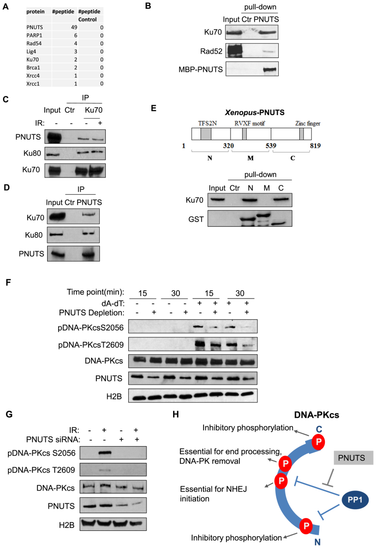 Figure 6. PNUTS associates with the Ku protein complex and regulates DNA-PKcs phosphorylation. (A) MBP-PNUTS pull-down was performed in Xenopus egg extracts. The pull-down product was resolved by SDS-PAGE, and analyzed by mass spectrometry. A number of DNA repair proteins were identified as binding patterns of PNUTS, as shown here with the numbers of peptides. A control pull-down was performed in Xenopus egg extracts using beads without MBP-PNUTS. (B) PNUTS pull-down was performed as in panel A. The extract input, control pull-down, and PNUTS pull-down samples were analyzed by immunoblotting for Ku70, Rad 52 and PNUTS. The ‘Ctr’ sample was a mock pull-down using empty amylose beads. (C) Ku70 IP was performed in the lysates of HeLa cell with or without IR-treatment. The lysate input, control IP, and Ku70 IP products were analyzed by immunoblotting for PNUTS, Ku80 and Ku70. (D) PNUTS IP was performed in HeLa cell lysates. The lysate input, control IP and PNUTS IP products were analyzed by immunoblotting for PNUTS, Ku70 and Ku80. (E) Three segments of PNUTS (N, M and C) were expressed with an N-terminal GST tag, and purified on glutathione beads, as described in Materials and Methods. The beads were incubated in Xenopus egg extracts, re-isolated, and analyzed by immunoblotting for Ku70 and GST. A mock pull-down using empty glutathione beads was performed as control (Ctr). (F) Xenopus egg extracts with or without PNUTS depletion were treated with (dA-dT)70, as indicated. The extract samples were analyzed by immunoblotting for DNA-PKcs phospho-S2056, DNA-PKcs phospho-T2609, DNA-PKcs, PNUTS and H2B. (G) HeLa cells were treated with PNUTS siRNA and 10 Gy IR, as indicated. The cell lysates were analyzed by immunoblotting for DNA-PKcs phospho-S2056, DNA-PKcs phospho-T2609, DNA-PKcs, PNUTS and H2B. (H) PP1 and PNUTS fine-tune the dynamic, and complex pattern of DNA-PKcs phosphorylation. PP1 is required for DNA-PKcs activation after DNA damage, presumably via dephosphorylation of multiple sites within the N, PQR and ABCDE regions. PNUTS modulates the action of PP1 toward S2056 and T2609, as the proper phosphorylation of these sites is required for end processing and ligation. |