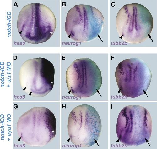 Fig. 2. Hes8is activated by Notch signaling. Expression of hes8, neurog1 and tubb2b in neural plate stage Xenopus embryos after injection of notch-ICD either alone (A-C) or together with six1 MO (D-F) or eya1 MO (G-I). Control side is shown on the left and injected side on the right (as indicated by blue lacZ staining). In each case, injection of notch-ICD leads to upregulation of hes8 (A, D, G) and repression of neurog1 (B, E, H) and tubb2b (C, F, I). Arrowheads indicate expression domains in developing placodes. Arrows indicate reductions in placodal expression while asterisks indicate increased expression in placodes or adjacent non-neural ectoderm. |