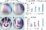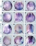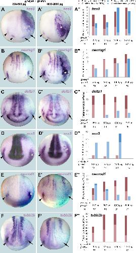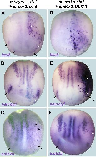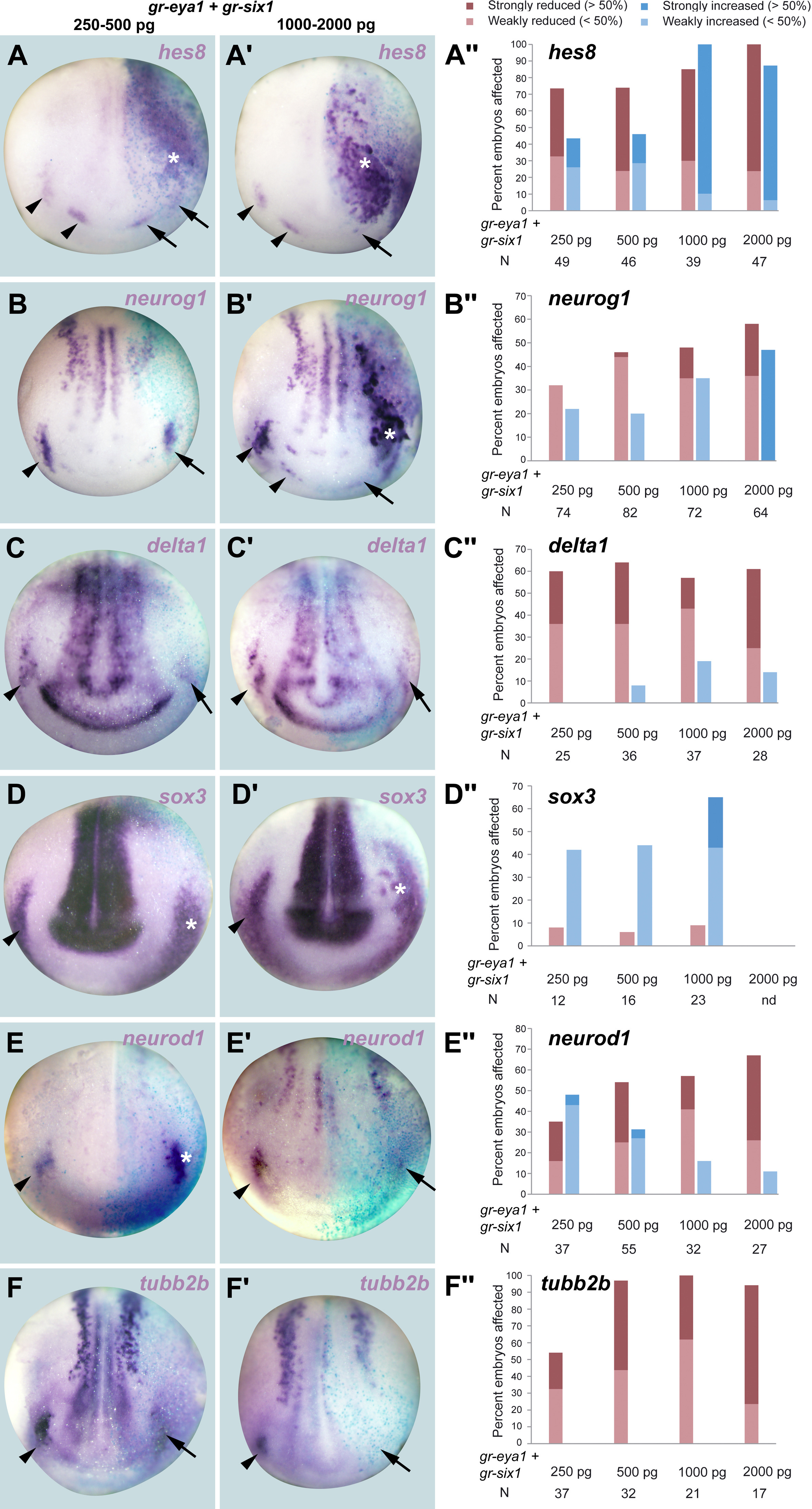 Fig. 4. Dose-dependent activation or repression of neurogenesis genes by Six1 and Eya1 at neural plate stages. A-F, Aâ²-Fâ²: Expression of various neurogenesis genes in neural plate stage Xenopus embryos after injection of low (first column, A-F) or high doses (second column, Aâ²-Fâ²) of gr-six1 and gr-eya1 mRNA followed by DEX activation at end of gastrulation. Control side is shown on the left and injected side on the right (as indicated by blue LcZ staining). Arrowheads indicate expression domains in developing placodes. Arrows indicate reductions in placodal expression while asterisks indicate increased expression in placodes or adjacent non-neural ectoderm. Note that embryos may have reductions in some placodes but increased expression elsewhere (Aâ²,Bâ²). Aâ²â²-Fâ²â²: Frequency of embryos with reductions of neurogenesis genes in PPR/placodes (red) or increases of neurogenesis genes in PPR/placodes or adjacent non-neural ectoderm (blue) after injection of different doses of gr-six1 and gr-eya1 mRNA. N: number of embryos analyzed. |