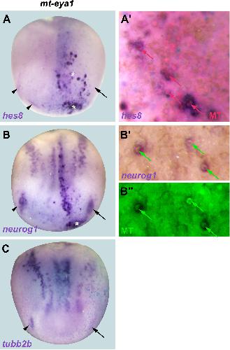 Fig. 5. Cell autonomous effects of Six1 and Eya1. A-C: Expression of hes8, neurog1 and tubb2b in neural plate stage Xenopus embryos after injection of a myc-tagged (mt) eya1 plasmid. Control side is shown on the left and injected side on the right (as indicated by blue LacZ staining). Arrowheads indicate expression domains in developing placodes. Arrows indicate reductions in placodal expression while asterisks indicate increased expression in placodes or adjacent non-neural ectoderm. Both hes8 and neurog1 but not tubb2b show ectopic expression. Aâ², Bâ², Bâ²â²: Ectopic expression of hes8 and neurog1 in non-neural ectoderm of embryos injected with mt-eya1 at higher magnification together with immunostaining for myc (MT). Colored arrows indicate hes8 and neurog1 expression in MT immunopositive cells. |