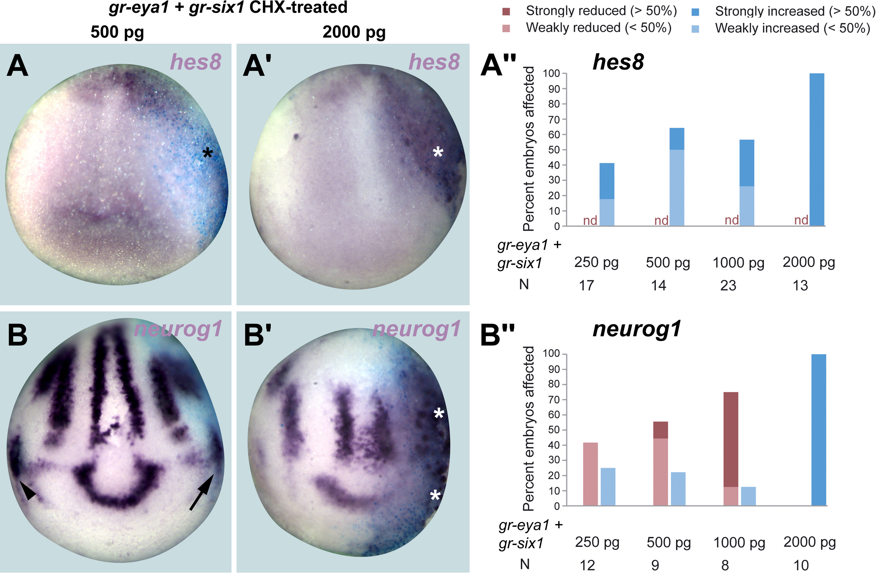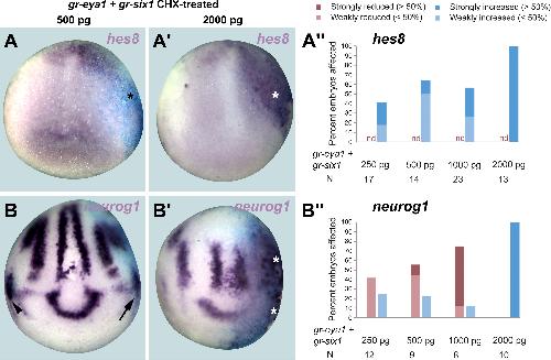 Fig. S3. Direct dose-dependent activation of hes8 andneurog1genes by Six1 and Eya1. A, B, Aâ², Bâ²: Expression of hes8 and neurog1 genes in neural plate stage Xenopus embryos after injection of low (A, B) or high doses (Aâ, Bâ²) of gr-six1 and gr-eya1 mRNA followed by CHX treatment and DEX activation at end of gastrulation. Control side is shown on the left and injected side on the right (as indicated by blue LacZ staining). Arrowheads indicate expression domains in developing profundal/trigeminal placodes. Arrows indicate reductions in placodal expression while asterisks indicate increased expression in placodes or adjacent non-neural ectoderm. Aâ²â², Bâ²â²: Frequency of embryos with reductions (red) or increases (blue) of hes8 or neurog1 expression after injection of different doses of gr-six1 and gr-eya1 mRNA. Numbers of embryos with increased expression rises with increasing dose of gr-six1 and gr-eya1 even if protein synthesis is blocked by CHX. N: number of embryos analyzed. |