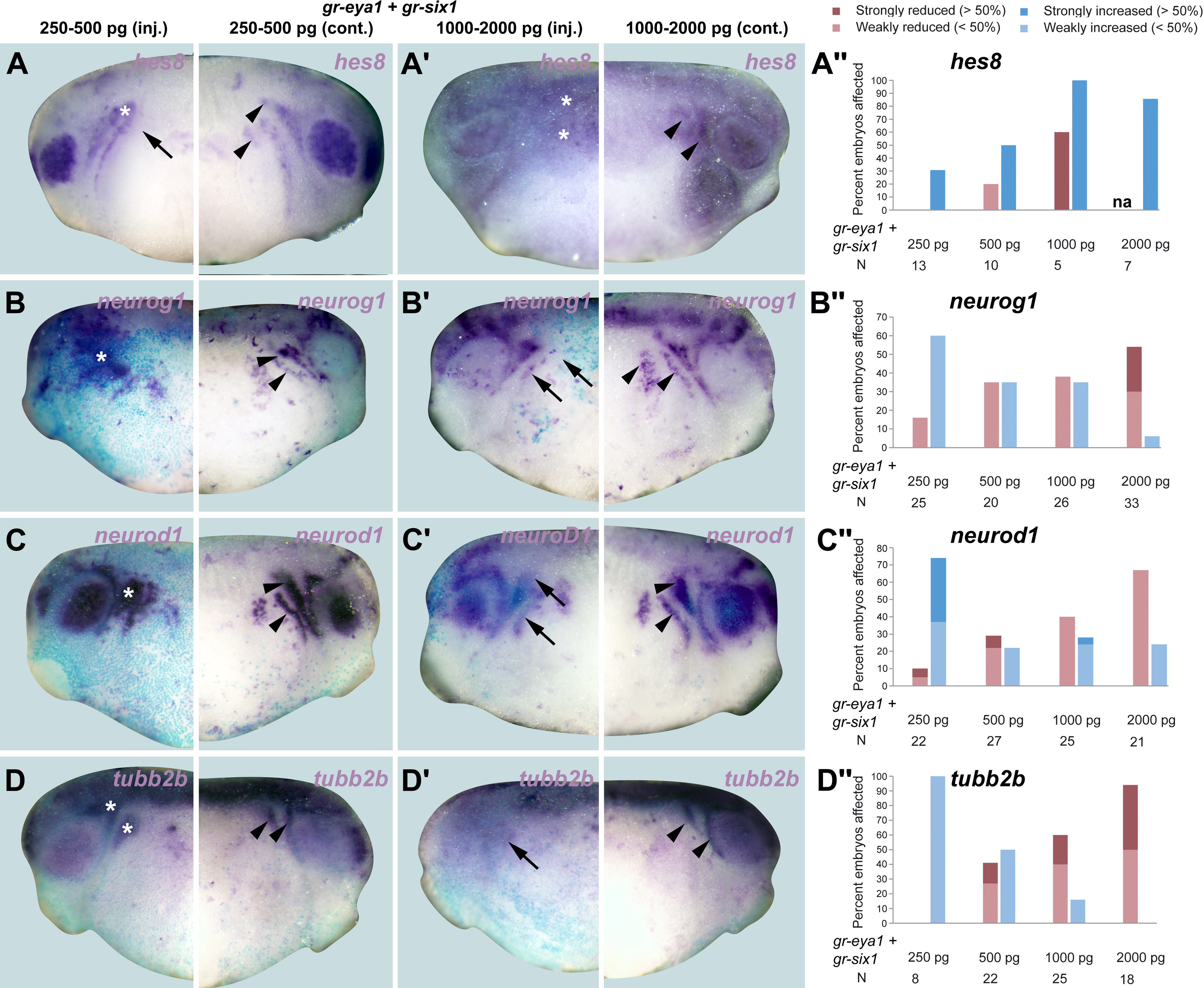 Fig. 6. Dose-dependent activation or repression of neurogenesis genes by Six1 and Eya1 at tailbud stages. A-D, Aâ²-Dâ²: Expression of various neurogenesis genes in tailbud stage Xenopus embryos after injection of low (A-D) or high doses (Aâ²-Dâ²) of gr-six1 and gr-eya1 mRNA followed by DEX activation at end of gastrulation. Control side is shown in the right and injected side in the left panels (as indicated by blue LacZ staining). Arrowheads indicate expression domains in developing placodes. Arrows indicate reductions in placodal expression while asterisks indicate increased expression in placodes or adjacent non-neural ectoderm. Aâ²â²-Dâ²â²: Frequency of embryos with reductions of neurogenesis genes in PPR/placodes (red) or increases of neurogenesis genes in PPR/placodes or adjacent non-neural ectoderm (blue) after injection of different doses of gr-six1 and gr-eya1 mRNA. N: number of embryos analyzed. |