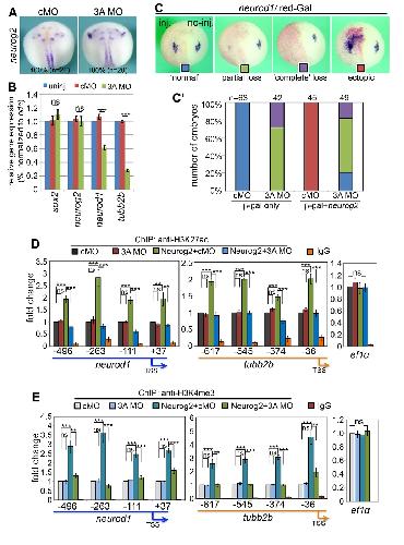 H3K27ac marks on the promoter regions of neurod1 (C) or tubb2b (D). (E)