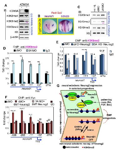 (E) Anti-KDM3A ChIP-qPCR analyses at stage 15 indicating that Neurog2 MO (80