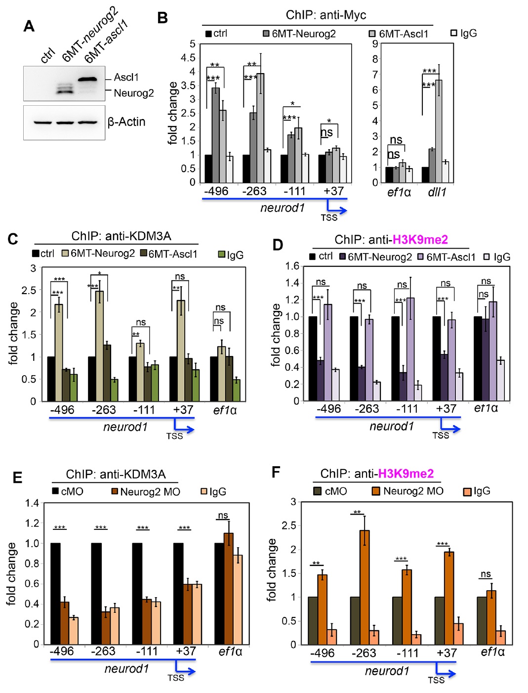 alter the H3K9me2 marks on the promoter regions of neurod1 (D) or tubb2b (E). (F)