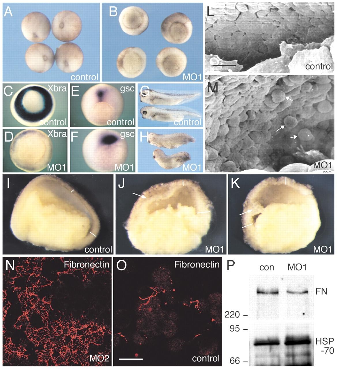 Fig. 4. Antisense morpholino oligonucleotides directed against Xcyr61 inhibit gastrulation movements but have little effect on mesodermal specification. (A,B) Morpholino oligonucleotide MO1 causes a severe retardation in blastopore closure (B) compared with control stage 12 embryos (A). (C,D) Morpholino oligonucleotide MO1 causes a decrease in Xbra expression and shifts the Xbra expression domain towards the animal pole. Embryos are at stage 11.5. (E,F) Morpholino oligonucleotide MO1 causes expansion of the goosecoid expression domain. Embryos are at stage 11.5. (G,H) Morpholino oligonucleotide MO1 (30 ng) causes shortening of the anteroposterior axis. Embryos are at stage 35. (I-K) Bisection of embryos injected with morpholino oligonucleotide MO1 reveals changes in the structure of the blastocoel roof and of the marginal zone. (I) Embryo previously injected with a control morpholino oligonucleotide at stage 11. The blastocoel roof and marginal zone are thin and compact, as indicated by the two white lines. (J,K) Morpholino oligonucleotide MO1 (30 ng) causes a thickening of the blastocoel roof and marginal zone (lines), and a separation of cell layers (arrows). (L,M) Scanning electron microscope images of a control embryo at stage 11 (L) and an embryo at the same stage previously injected with 30 ng antisense morpholino oligonucleotide MO1 (M). Note the tightly packed epithelial appearance of the cells in the blastocoel roof of the control embryo (L), and the more loosely packed appearance of cells in the MO1-injected embryo, with some cells apparently about to detach (arrows; M). Note also that the migration of the large flat mesendodermal cells visible at the bottom of (L) is impaired in MO1-injected embryos (M). (N,O) Morpholino oligonucleotide MO2 causes a decrease in fibronectin assembly in the blastocoel roof. (N) Fibronectin forms an elaborate fibrillar network in the blastocoel roof of control embryos. (O) Fibronectin assembly is reduced in the blastocoel roof of morpholino-injected embryos. (P) Western blot analysis indicates that levels of fibronectin are similar in control and morpholino-injected embryos. HSP-70 was used as a loading control. Scale bars: in L, 100 μm for L,M; in O, 100 μm for O,N.