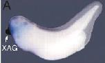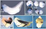 Fig. 10. Xcyr61 induces formation of cement glands in Xenopus animal caps and synergises with a truncated BMP receptor (tBR) to induce additional heads. (A) Xenopus embryo at stage 32 showing expression of the cement gland marker XAG1. (B) Induction of XAG1 in animal caps by Xcyr61. (C) Induction of a partial secondary axis by tBR (15 out of 46 cases). (D) Induction of a partial secondary axis by Xcyr61 (19 out of 90 cases). (E) Induction of an additional head by co-expression of tBR and Xcyr61 (18 out of 83 cases; an additional 18 embryos displayed partial secondary axes). Muscle in C and D is marked by monoclonal antibody 12/101.