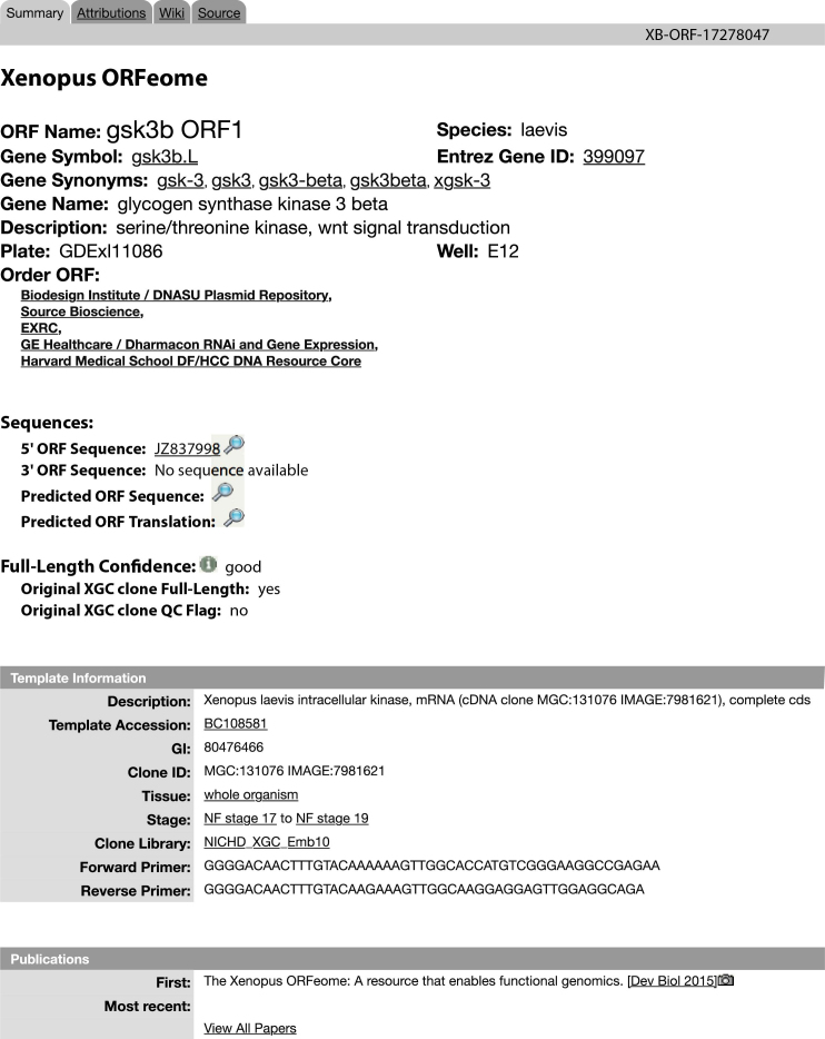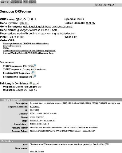 Figure 4. ORFeome page associated with an X. laevis gene.