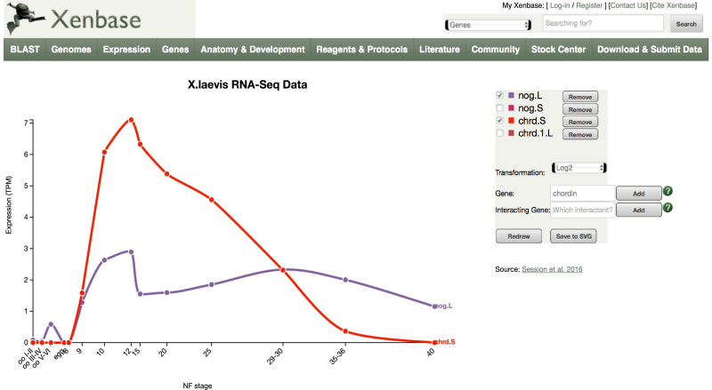 Figure 1. Interactive RNA-Seq visualization. After selecting the central panel for X. laevis temporal data on a Gene Page ‘Expression’ tab, a larger window with additional controls opens as shown. A second gene, chordin, was added to further customize the view as described in the main text. Note that the noggin profile (purple) has been rescaled on the Y axis to accommodate the higher level of transcription of the chordin gene (red).