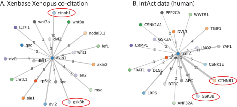 Figure 3. Comparison of Xenopus literature gene co-citation to human protein interaction data from IntAct. A. Genes co-cited with axin1 in Xenbase. Two key interactants, ctnnb1 (beta-catenin, 10 co-citations) and gsk3b (glycogen synthase kinase 3 beta, 8 co-citations) are circled in red. B. IntAct data on human proteins interacting with AXIN1. CTNNB1 has 35 results and GSK3B has 41 results, ranging from co-immunoprecipitation and yeast two-hybrid interactions, to fluorescence polarization spectroscopy and protein kinase assays (click on interactions hyperlink on Xenbase to view evidence).