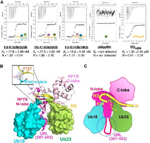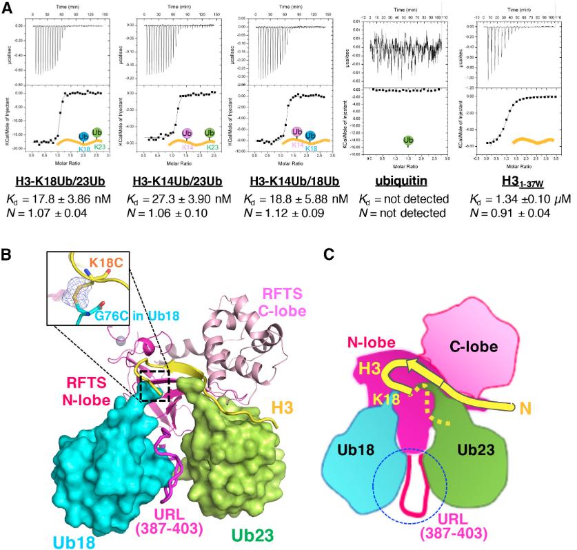 (A) ITC thermograms (upper) and plots of corrected heat values (lower) for binding of the hRFTS to H3-K18Ub/23Ub, H3-K14Ub/23Ub, H3-K14Ub/18Ub, ubiquitin, and H31-37W. See also Figure S2.