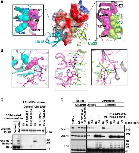 (C) Purified recombinant FLAG-tagged wild-type xDnmt1, I317A/I362A, or P253A/L256A were coupled with anti-FLAG M2 beads and then incubated with MNase-digested chromatins isolated from control or UbVS-treated extracts in the presence of excess wild-type Ub. The resultant complexes and the inputs were analyzed by immunoblotting.