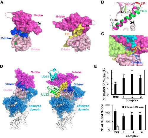 (A) The N- and C-lobes and K18Ub/23Ub are shown as a surface model. The magnified figure shows the |Fo| − |Fc| omit map contoured at 3 σ superposed on the H3. The density map and H3 tail are shown as blue mesh and a yellow stick model, respectively. Trp464 shown as a pink sphere acts as a wall that kinks the H3 tail at the peptide bond between Gly12 and Gly13. See also Figure S5.