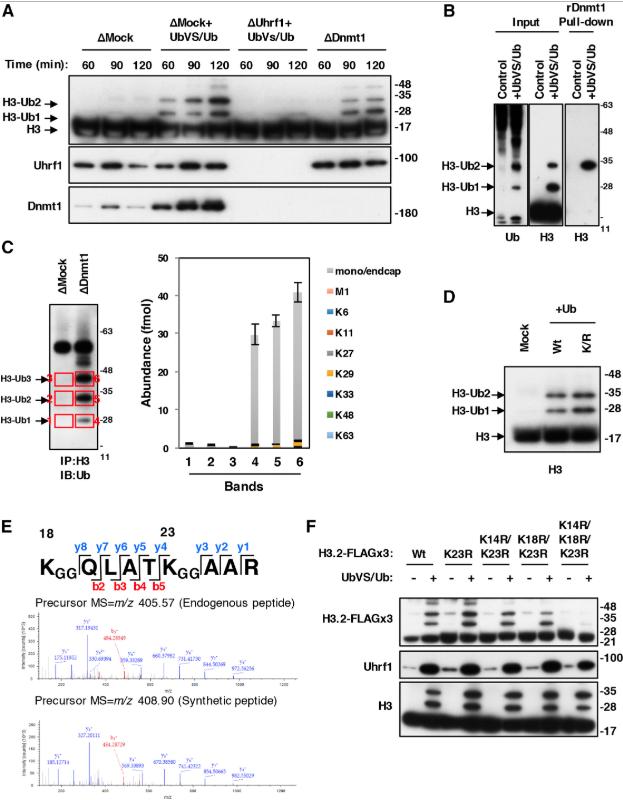 (E) MS/MS spectra identifying ubiquitylations at both K18 and K23 on histone H3. The upper spectra were obtained from mDnmt1-FLAG-associated two-mono-ubiquitylated histone H3 prepared as described in Figure 1B. The lower spectra are from synthetic, isotopically labeled peptides; identified b and y fragment ions are shown. See also Figure S1.