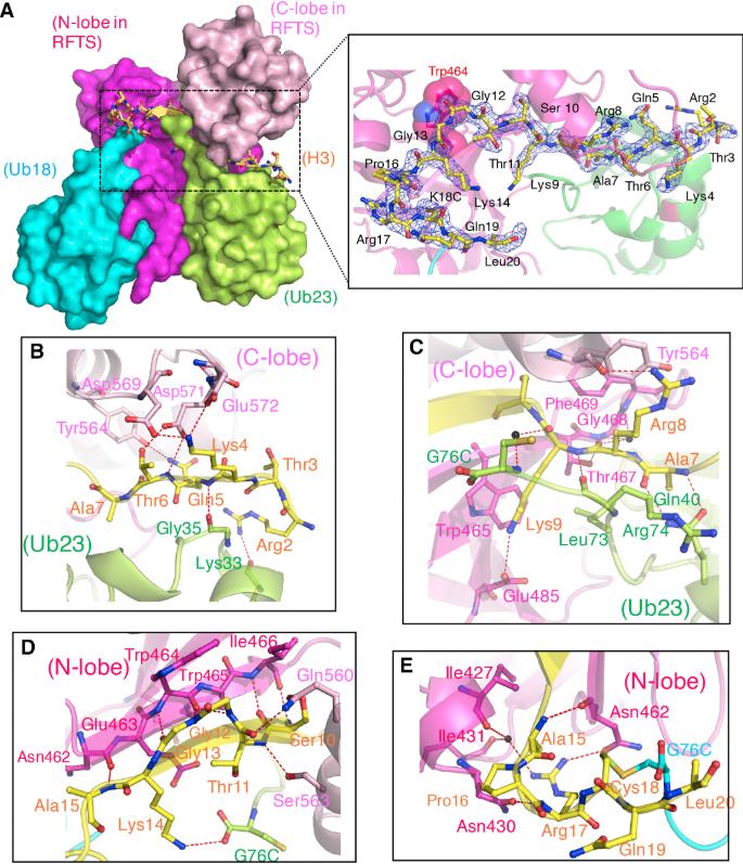 (B) Ribbon representation of hRFTS in complex with H3-K18Ub/23Ub. N- and C-lobes, Ub18, Ub23, and the H3 tail are colored magenta, pink, cyan, green, and yellow, respectively. The enlarged figure shows disulfide-mediated ubiquitylation between G76C in Ub18 and K18C in H3, on which the |Fo| − |Fc| omit map contoured at 4 σ is superposed. See also Figure S3.