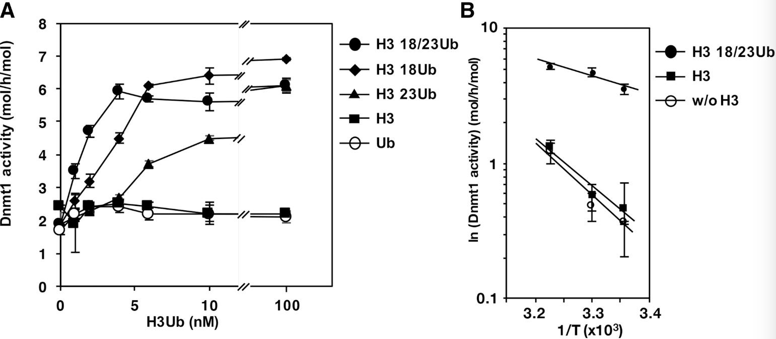 (B) The methylation activity of Dnmt1 was measured at 25°C, 30°C, and 37°C. The logarithms of DNA methylation activities obtained (ln[DNA methylation activity], ordinate axis) against inverse temperatures (1/T, abscissa) are plotted (Arrhenius plot). |