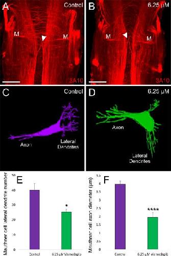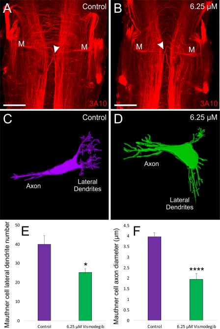 Figure 5. Effect of Vismodegib treatment on Mauthner Cell Development. A, 3A10 antibody labeling of a pair of Mauthner cells from a control Xenopus. B, 3A10 antibody labeling of a pair of Mauthner cells from an animal treated with 6.25 µM Vismodegib. Arrowheads for A and B indicate axon crossing at the midline. C, 3D reconstruction of a control Mauthner cell from dextran amine labeling. D, 3D reconstruction of a Mauthner cell from an animal treated with 6.25 µM Vismodegib. E, Shh inhibition results in a significant reduction in the degree of branching of the Mauthner cell in 6.25 µM Vismodegib-treated animals (nâ=â4) compared with control animals (nâ=â4). F, Shh inhibition results in an approximately two-fold reduction in axonal diameter of the Mauthner cell in 6.25 µM Vismodegib-treated animals (nâ=â3) compared with control animals (nâ=â5). Scale bars represent 100 µm.* pâ<â0.05, ****pâ<â0.0001. [Color figure can be viewed at wileyonlinelibrary.com]