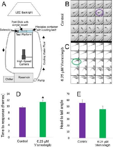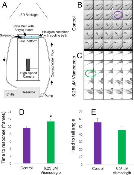 Figure 6. Impact of Vismodegib treatement on tadpole swimming behavior. A, Schematic of imaging apparatus utilized for recording tadpole swimming behavior and the C-start response following a controlled perturbation, as described by Zarei et al. (2017). B and C, Images of the first 25 frames captured following initiation of the stimulus for both control animals (B) and animals treated with 6.25 µM Vismodegib (C). Control animals on average took 9 frames to elicit the C-start response (purple circle), whereas animals treated with 6.25 µM Vismodegib took 11 frames (green circle), based on the criteria described in Zarei et al. (2017). D, The time to elicit a C-start response was significantly longer in animals treated with 6.25 µM Vismodegib than in control animals. * pâ<â0.05. E, Although not significant, the maximal flexion in animals treated with 6.25 µM Vismodegib was, on average, tighter than that of control animals, resulting in an atypical U-shaped configuration instead of the normal C-shaped configuration. [Color figure can be viewed at wileyonlinelibrary.com]
