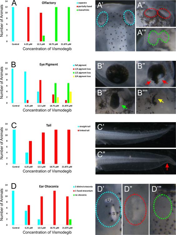 Figure 1. Varied concentrations of Vismodegib result in a dose-dependent effect on phenotypic changes. A, Control tadpoles display two distinct olfactory groves (Aâ²). However, increasing Vismodegib concentration results in an increasing tendency toward complete fusion of the two groves (Aâ²-Aâ²â²). Animals treated with 6.25 µM Vismodegib exhibited partially fused olfactory epithelia (Aâ²). By 18.75 µM of Vismodegib, all animals exhibited complete fusion of the olfactory epithelia (Aâ²â²). B, Eye pigmentation was also affected following treatment with Vismodegib. Compared with control animals, which exhibited full eye pigmentation (Bâ²), animals treated with 6.25 µM Vismodegib began to lose eye pigmentation in the ventral part of the eye (Bâ²). This loss of ventraleye pigmentation was more profound in animals treated with 12.5 µM Vismodegib. About half of animals treated with 18.75 µM had pigment loss in half of the ear [sic- eye] (Bâ²â²). In a couple animals treated with 18.75 µM and about one third of animals treated with 21.875 µM Vismodegib had very little eye pigment remaining (Bâ²â²). C, Tail development was variably affected as a result of reduced Shh signaling. Animals treated with 12.5, 18.75, and 21.875 Vismodegib exhibited a kink at the caudal portion of their tails (Câ²) compared with the straight tail of control animals (Câ²). At 6.25 µM Vismodegib, fewer animals exhibited kinked tails. D, Aberrations in otoconia development were also evident with Vismodegib treatment. Control tadpoles had two distinct otoconia (Dâ²). Some animals treated with 6.25 µM Vismodegib, most animals treated with 12.5 µM Vismodegib, and all animals treated with 18.75 µM Vismodegib had a single otoconia mass (Dâ²). A couple animals treated with 21.875 µM lacked otoconia formation altogether (Dâ²â²), whereas the rest had one otoconia mass (Dâ²). [Color figure can be viewed at wileyonlinelibrary.com]