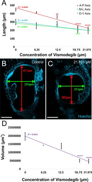 Figure 2.Reduction in ear length along both the anteroposterior and mediolateral axes in Vismodegib treated tadpoles. A, The reduction in ear length along anteroposterior, mediolateral, and dorsoventral axes followed a linear dose response curve. This decrease in ear size was more profound along the anteroposterior dimension of the ear compared with the mediolateral or dorsoventral dimension of the ear. While ears from animals treated with 12.5 µM and greater doses of Vismodegib were significantly reduced in length along the anteroposterior axis from controls, only 18.75 and 21.875 µM Vismodegib-treated animals were significantly reduced along the mediolateral axis from controls. The reduction in length along the anteroposterior axis at the highest dose of Vismodegib was â¼2-fold, whereas along the mediolateral axis, it was only â¼1.3-fold. B, Illustration of lengths measured along the anteroposterior axis and mediolateral axis in the ear of a stage 46 control tadpole. C, Illustration of lengths measured along the anteroposterior axis and mediolateral axis in the ear of a stage 46 tadpole treated with 21.875 µM Vismodegib. Scale bars represent 100 μm. D, The reduction in approximate volume as calculated from the anteroposterior, mediolateral, and dorsoventral lengths from each ear followed a linear dose response curve. The volumes of animals treated with 18.75 µM and 21.875 µM Vismodegib were significantly reduced to â¼1/4th the volume of controls. * pâ<â0.05, ** pâ<â0.01, ***pâ<â0.001, ****pâ<â0.0001 (ANOVA). [Color figure can be viewed at wileyonlinelibrary.com]