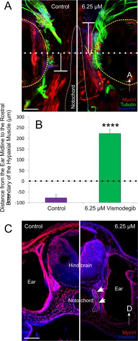 Figure 4. Rostral expansion of hypaxial muscle fibers following Vismodegib treatment. A, The distance from the ear midline from the rostral boundary of the somites was calculated from animals immunostained with antibodies against tubulin (green), MyoVI (red) and counterstained with Hoechsts to label neurons, hair cells and muscletissue, and nuclei, respectively. A line was drawn through the midline of the ear (dotted line), calculated from the anteroposterior diameter of the ear. From that line, the distance to the rostral boundary of the somites was determined (T-shaped line). Positive values were assigned for distances rostral to the midline and negative values for distances caudal to the midline. B, Means plus or minus standard errors of the mean for both controls and animals treated with 6.25 µM Vismodegib calculated using the method from (A). ****pâ<â0.0001 C, Coronal section showing that hypaxial muscle fibers (outlined and arrows) expanded between the brain and the ear in animals treated with 6.25 µM Vismodegib. Scale bars represent 100 μm. [Color figure can be viewed at wileyonlinelibrary.com]