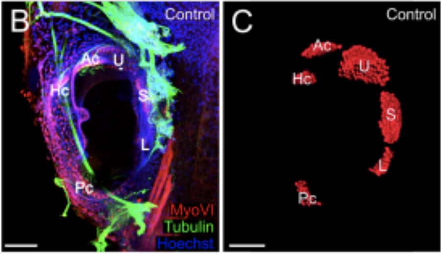 Xenopus inner ear sensory epithelia. B (left): Immunohistochemistry using antibodies against Tubulin (green) label neurons and MyoVI (red) label auditory hair cells. Ac, anterior canal crista; Hc, horizontal [=lateral] canal crista; Pc, posterior canal crista; U, utricle; S, sacculus; L, lagena. In C (right), a 3D reconstruction of hair cells shows that there are six distinct sensory epithelia zones. Scale bars represent 100 μm.