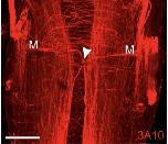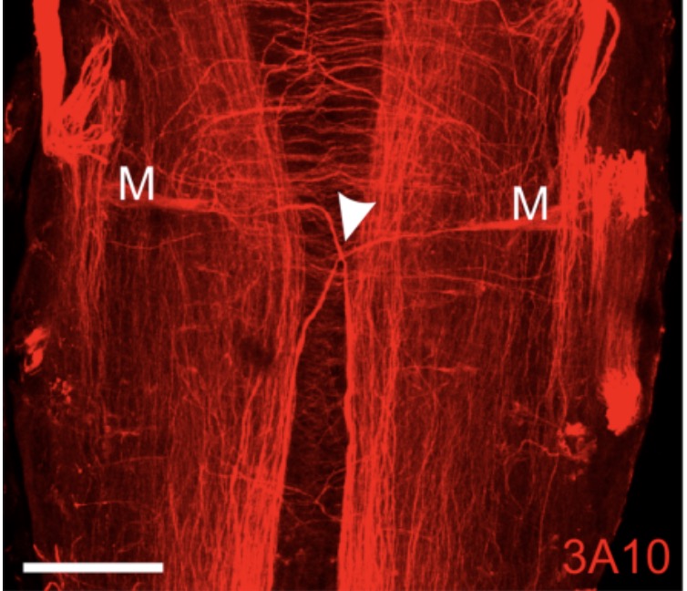 Neuronal Ab4 (aka 3A10) labeling of a pair of Mauthner cells ( M, arrow head) from the inner ear of Xenopus.