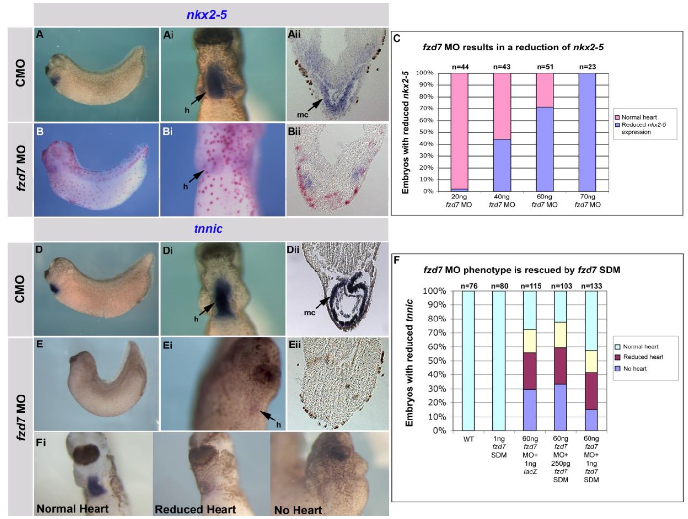 leads to reduction/loss of nkx2-5 expression in a dose-dependent manner. (F, Fi). Fzd7
