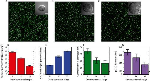 Figure 2. Effect of oocyte development on the density, the number and the diameter of the nuclear pore complexes. (A–C) dSTORM images of nuclear envelopes from oocytes respectively at stage II, IV and VI. The central channel is labelled with fluorescent WGA-Alexa647. Scale bar 5 µm. Insets: Stereomicroscope images of the oocyte respectively at stage II, IV and VI. Scale bar 50 µm. (D) Effect of oocyte development on nuclear pore complex density. (E) Effect of oocyte development on nuclear pore number per nucleus. (F) Effect of oocyte development on central channel diameter. (G) Effect of oocyte development on gp210 diameter. For each condition, the number of investigated NPC is superior to 300 000. Errors are experimental standard errors. The precision of the measurements was assessed by bootstrapping and by comparing different rounds of experiments.