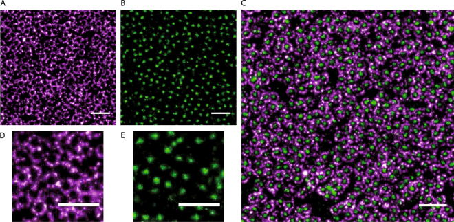 dSTORM imaging of the nuclear envelopes from X. laevis oocytes. (A) dSTORM image of a spread nuclear envelope labelled with anti-gp210 primary antibody and Alexa647 secondary antibody. (B) dSTORM image of a spread nuclear envelope labelled with WGA-Alexa488. Scale bar 500 nm. (C) dSTORM image of a spread nuclear envelope labelled with WGA-Alexa488 (green) and gp210-Alexa647 (magenta). (D) Zoom on the image (A). (E) Zoom on the image (B).