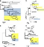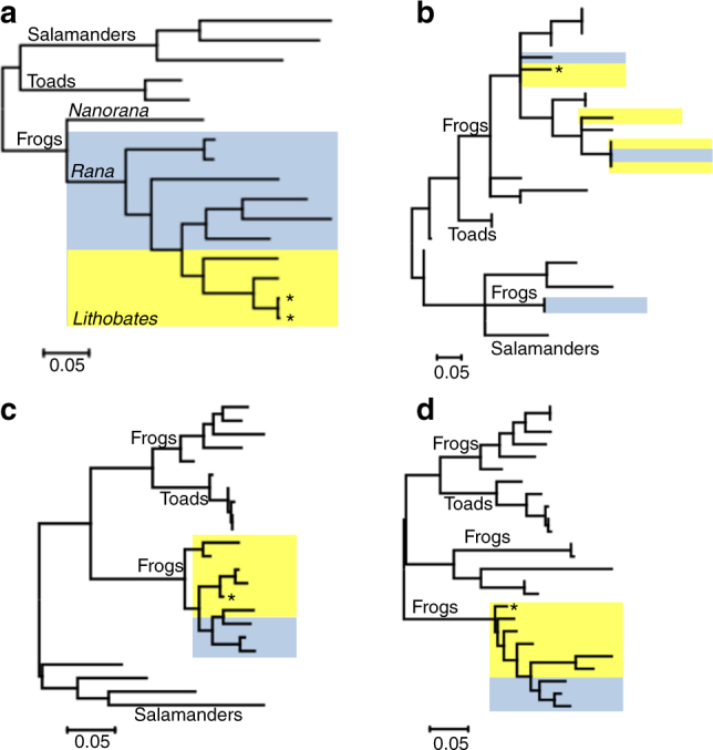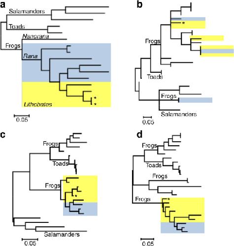 Fig. 2. Molecular phylogenetic analysis of amphibian mitochondrial genomes and genes. The phylogenetic tree is drawn to scale, with branch lengths measured in the number of substitutions per site. The analysis involved a complete mitochondrial (Mt) genome sequences of salamanders, toads and frogs, classified as Rana (blue highlight) or Lithobates (yellow highlight). Analysis of Mt genes b