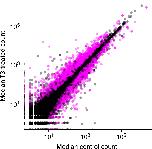 Fig. 1. Median DESeq2-normalized counts of genes detected in the back skin of premetamorphic Rana catesbeiana tadpoles treated with vehicle control or T3 for 48 h. Gene transcripts determined to be significantly differentially expressed (DESeq2 adjusted p-value < 0.05) are indicated in pink, while the remainder are semi-transparent black to convey density. Both predicted protein coding and putative lncRNA genes are depicted