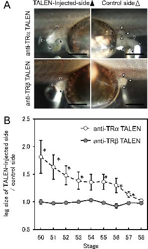 Figure 2. Effect of TR and TR ablation on hind limb development. A total of 200 pg of TALEN-ELD/KKR mRNA mixture was injected into one side of two- or four-cell embryos with mCherry mRNA to modify TR or TR. Embryos that expressed mCherry on the left side or right side were separated under a fluorescence dissecting microscope and reared individually. Developmental stages 50 to 58 were determined based on the hind limb development of the control side. Stage was recorded every day. (A) Lateral view of the hind limb on the TALEN-ELD/KKR mRNA-injected (black arrowheads) and control (white arrowheads) sides. Scale bars, 1 mm. (B) The ratio of the length of the hind limb on the TALEN-ELD/KKR mRNA-injected side to that on the control side was calculated. Data are expressed as mean SE [n = 9 (TR) or 4 (TR)]. Significant differences between TR (open circle)- and TR (gray circle)-modified tadpoles were determined by performing a Student t test. *P < 0.05.