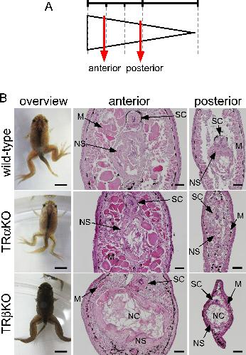 Figure 5. Histological analysis of wild-type and TR-knockout tadpole tails during climax of metamorphosis. (A) Schematic representation showing tail sampling. A tail was sectioned at one-sixth (anterior) the distance from the tail base and at the middle (posterior), as indicated by red arrows. (B) Overview and cross sections of wild-type, TRα-knockout, and TRβ-knockout stage-63 tadpole tails in the anterior and posterior regions. Histological images are representative of three individuals examined per panel. Sections were stained with hematoxylin and eosin. Abbreviations: M, muscle; NC, notochord; NS, notochord sheath; SC, spinal cord. Scale bars, 5 mm (overview) and 0.1 mm (anterior and posterior sections).