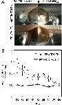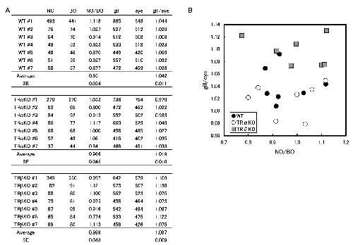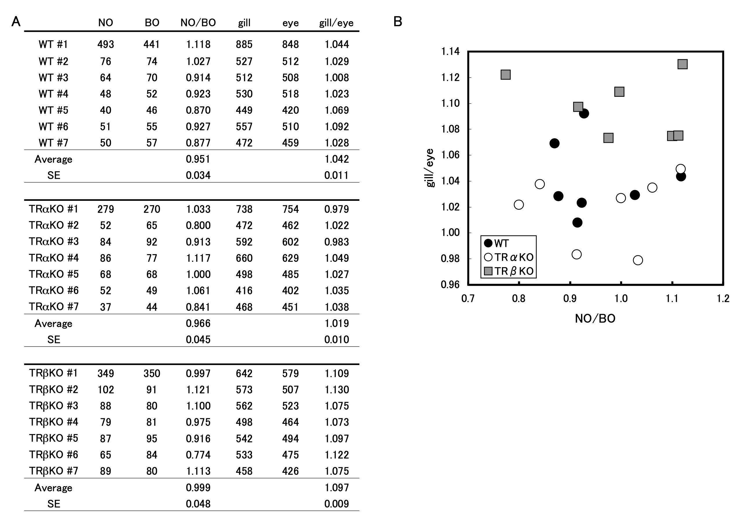 Supplemental Figure 1. TRβ-knockout tadpoles showed a delay of gill resorption. (A) The length of nervus olfactorius (NO), bulbus olfactorius diameter (BO), width at gill position (gill) and width at eye position (eye) were measured on the digital image. Data were represented by the pixel number. Note that the size values are pixel numbers of NO, BO and widths, and are reflected by the resolution of pictures. The ratios of NO/BO and gill/eye were also indicated. #1-#7 represent the individual tadpole. The picture of #1 tadpoles were used in the Fig. 3. (B) The relation of gill/eye to NO/BO in all individual. |