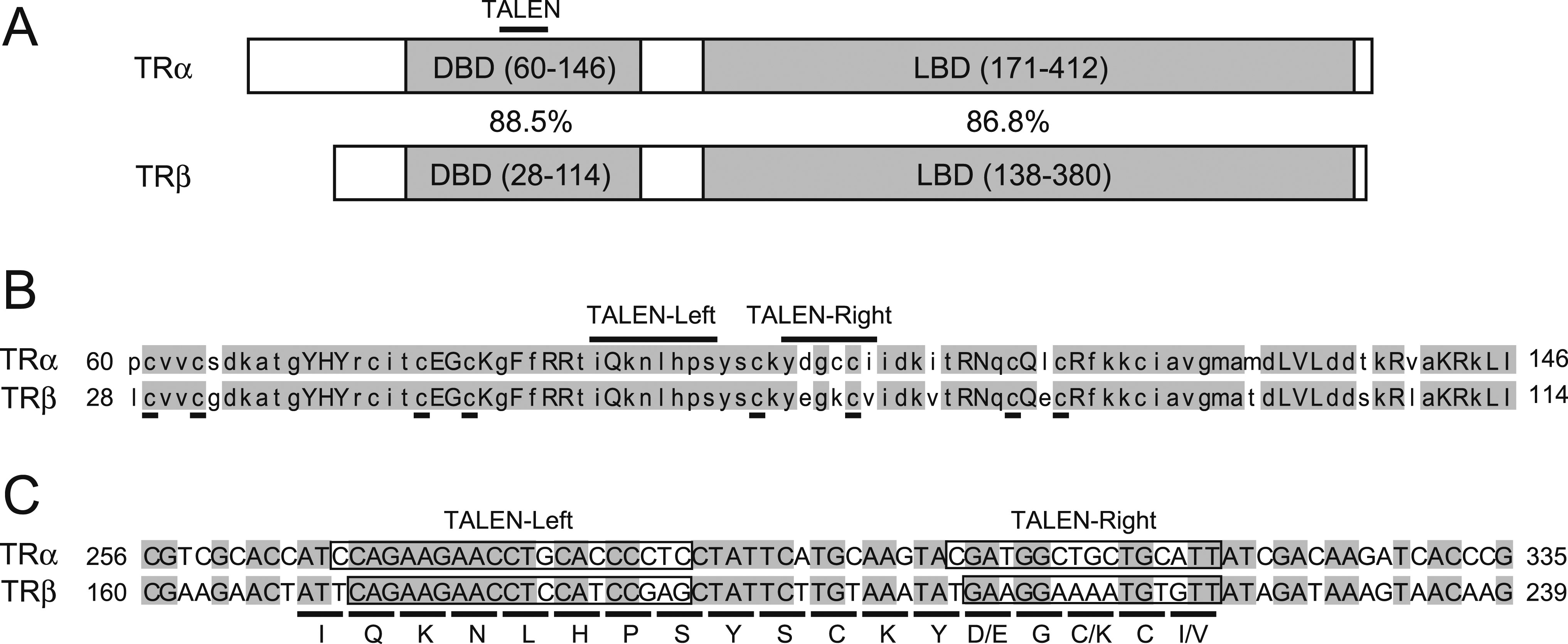Figure1. Target sites for anti-TRα and anti-TRβ TALENs. (A) Schematic illustrations of X. tropicalis TRα and TRβ proteins. The amino acid identities in the DNA-binding domain (DBD) and the ligand-binding domain (LBD) are shown. A horizontal bar indicates the TALEN target site. (B) Comparison of the amino acid sequences of TRα and TRβ DBDs. The identical amino acids between TRα and TRβ are shaded. Horizontal bars indicate TALEN target sites. Zinc-binding amino acids are underlined. The DNA-binding amino acids are represented by a capital letter. (C) Comparison of nucleotide sequences of TALEN target sites in TRα and TRβ genes. Identical nucleotides between TRα and TRβ are shaded. Boxes indicate TALEN target sites. The bars below the nucleotide sequence show the frame of amino acid sequences. The amino acid sequences are indicated at the bottom.