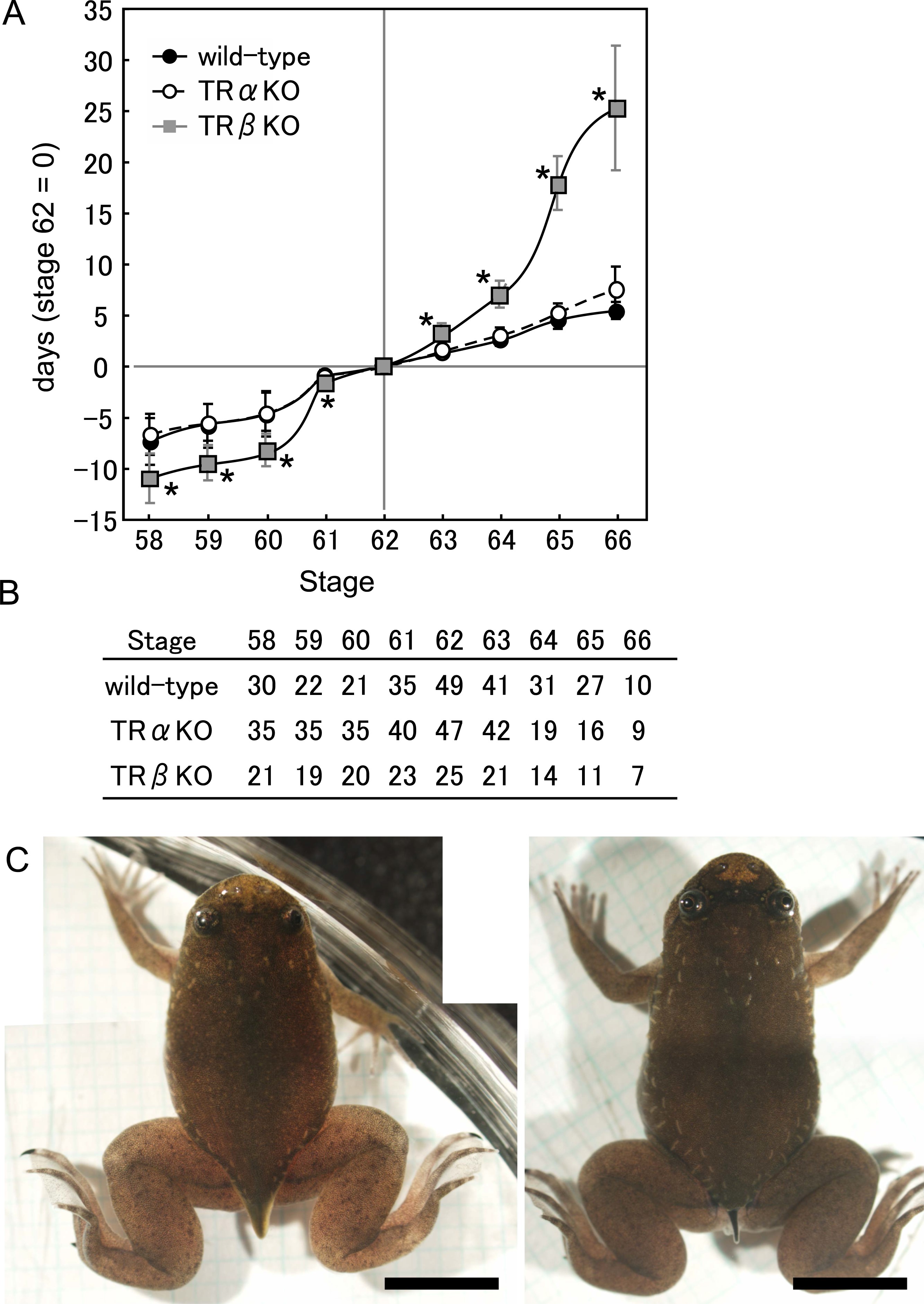 Figure 3. Development of wild-type and TR-knockout tadpoles during climax of metamorphosis. Tadpoles were reared individually and stage was recorded every day. (A) The time in days to reach the indicated stage, from stage 62, for wild-type (filled circle), TR-knockout (open circle), and TR-knockout (gray square) tadpoles is plotted. Data are expressed as mean standard deviation. Significant differences between wild-type and TR-knockout tadpoles and between TR-knockout and TR-knockout tadpoles were determined by performing a Bonferroni test. *P < 0.005. (B) The sample number of each group. (C) Representative images of stage-65 wild-type (left) and TR-knockout (right) animals. This TR-knockout individual (22 days from stage 62) had an adult head and a pin-like tail, and ate worm as a wild-type froglet. Scale bars, 5 mm.