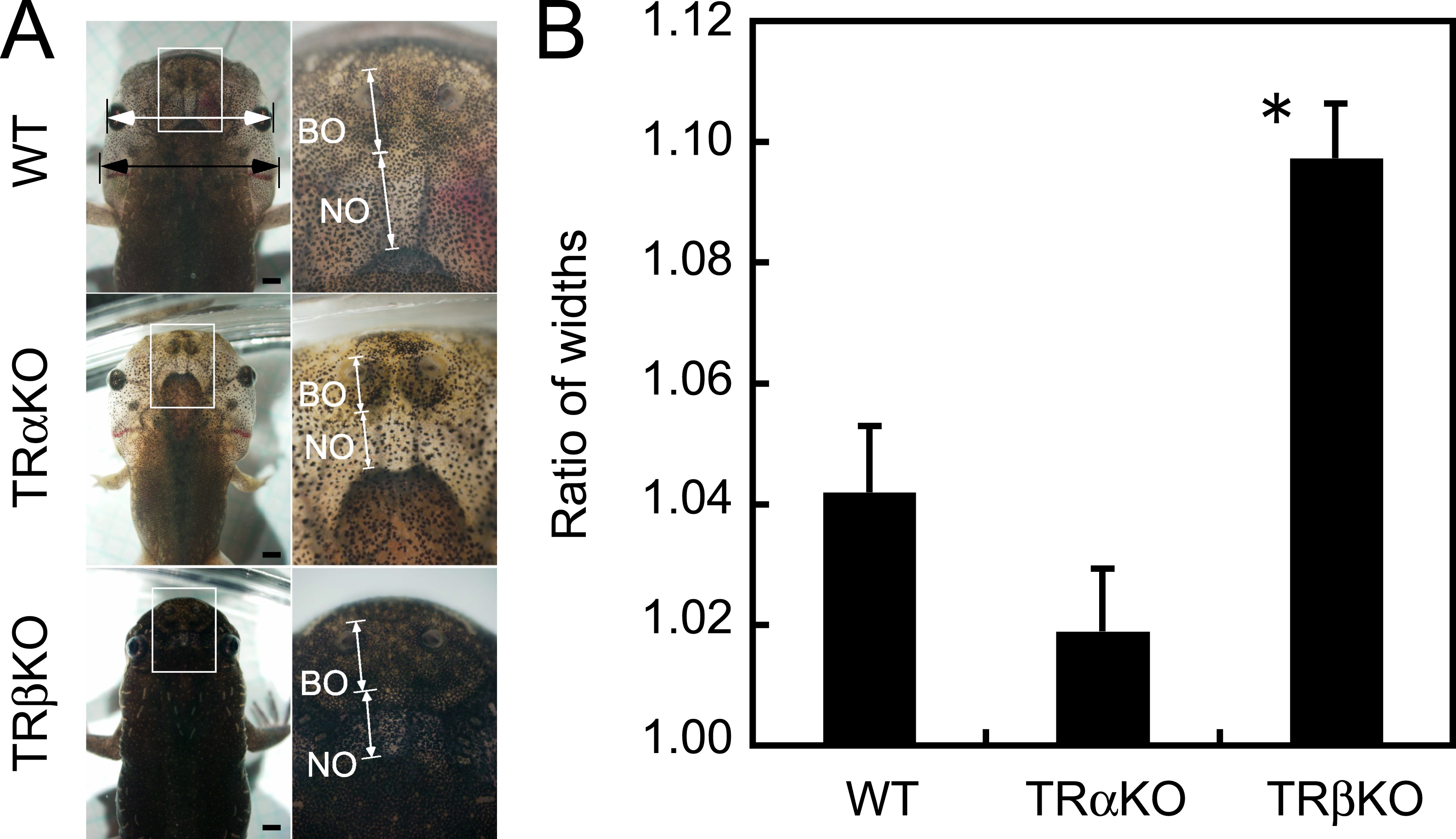 Figure. 4. Head narrowing in wild-type and TR-knockout tadpoles during climax of metamorphosis. (A) Images depicting the heads of wild-type and TR-alpha and TR-beta knockout stage-61 tadpoles. White boxes in the left panel were enlarged and are shown in the right panel. Abbreviations: BO, bulbus olfactorius; NO, nervus olfactorius. Scale bars, 1 mm. (B) The ratio of the width at gill position [black arrow in the left panel of (A)] to the width at eye position [white arrow in the left panel of (A)] was calculated using enlarged images. Data are expressed as mean SE (n = 7). Statistical significance, by comparing to wild-type animals, was assessed using a Dunnett test. *P < 0.005.