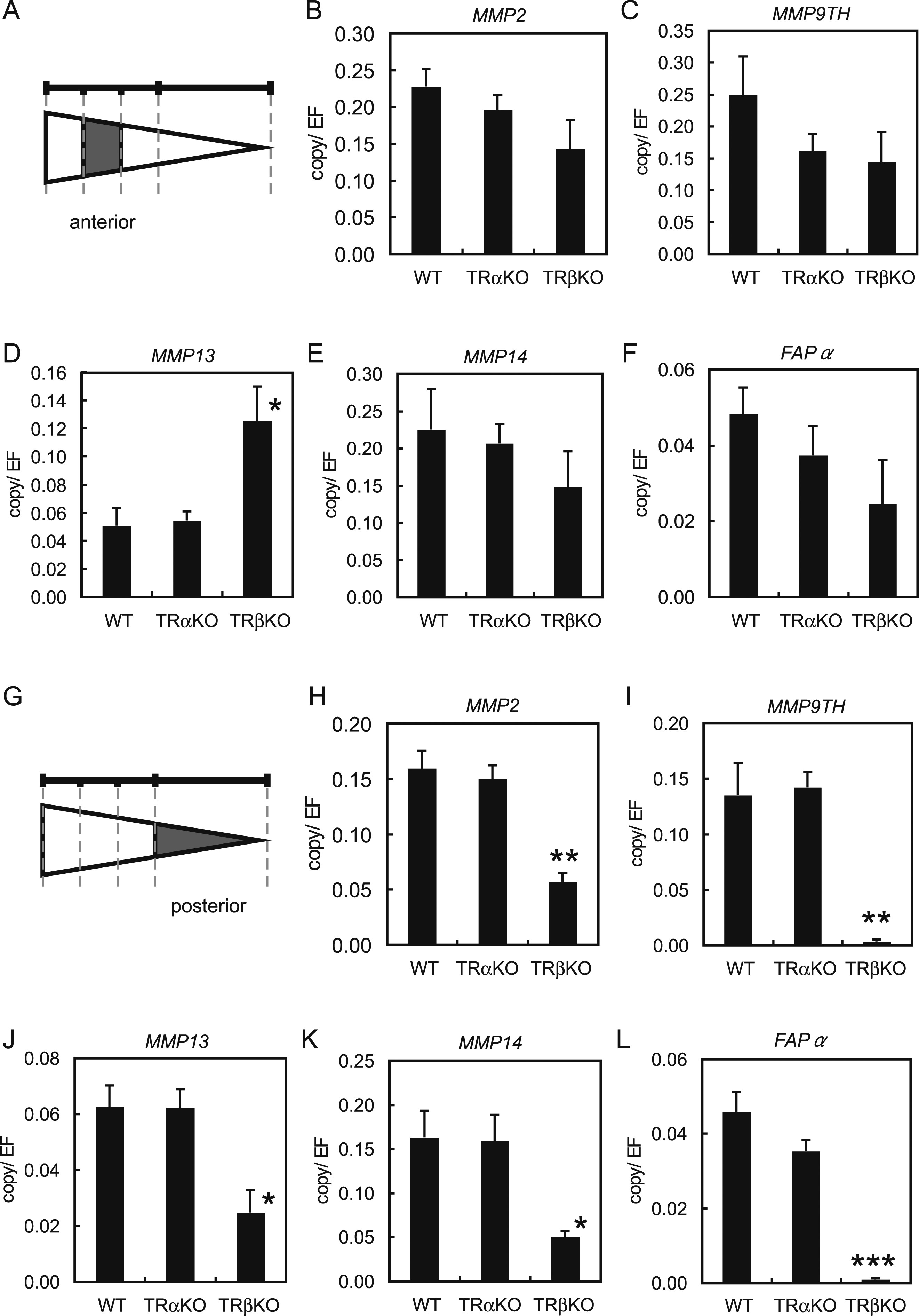 Figure 6. mRNA expression of genes encoding ECM-degrading enzymes in wild-type and TR-knockout tadpole tails during climax of metamorphosis. (A and G) Schematic representation showing sampling of the anterior (A) and posterior (G) tail parts. (B–F) Expression levels of (B) MMP2, (C) MMP9TH, (D) MMP13, (E) MMP14, and (F) FAPα in the anterior part of wild-type, TRα-knockout, and TRβ-knockout stage-63 tadpoles, as determined by RT-PCR. (H–L) Expression levels of (H) MMP2, (I) MMP9TH, (J) MMP13, (K) MMP14, and (L) FAPα in the posterior part of wild-type, TRα-knockout, and TRβ-knockout stage-63 tadpoles, as determined by RT-PCR. Data are expressed as mean ± SE (n = 3). Statistical significance was assessed by comparing to wild-type animals using the Dunnett test. *P < 0.05, **P < 0.005, ***P < 0.0005.