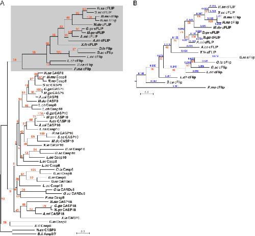 Fig. 2. Molecular phylogenetic analysis of c-FLIP and its paralogous proteins. (A) A molecular phylogenetic tree of c-FLIP and its paralogs, CASP8, CASP10, CASP18, and CARD-casp8 was constructed by RAxML, based on an alignment of the protease-like/protease (CASc*/CASc) domains (145 amino acid sites without mismatches including insertion/deletion (indel)). Human CASP3 and amphioxus CASP3-like AmphiCASP3/7 proteins were used as an out-group for rooting the tree. Numbers (in orange) at internal branches indicate the percentage of support of that branching pattern based on a bootstrap method with 100 replicates (bootstrap probabilities). The scale bar indicates the evolutionary distance of 0.2 amino acid substitutions per site. (B) A molecular phylogenetic tree restricted to the c-FLIP subfamily proteins. The tree was constructed by RAxML, based on an alignment of the c-FLIP CASc* domains (164 amino acid sites) derived from 17 animal species including zebrafish. The number (in blue) above each branch shows branch length, while the number (in orange) beneath each internal branch shows bootstrap probability. The scale bar indicates the evolutionary distance of 0.2 amino acid substitutions per site. The identification numbers of the c-FLIP subfamily and its paralogous proteins shown in the tree are listed in Table A1. Abbreviations of the species: A.ca, A. carolinensis (anole lizard); A.mi, A. mississippiensis (alligator); B.fl, B. floridae (lancelet); D.re, D. rerio (zebrafish); G.ac, G. aculeatus (stickleback); G.ga, G. gallus (chicken); H.sa, H. sapiens (human); L.ch, L. chalumnae (coelacanth); L.er, L. erinacea (little skate); L.oc, L. oculatus (spotted gar); M.do, M. domestica (opossum); M.ga, M. gallopavo (turkey); M.mu, M. musculus (mouse); O.la, O. latipes (medaka); R.no, R. norvegicus (rat); S.ca, S. canicula (catshark); S.sc, S. scrofa (pig); X.la, X. laevis (African clawed frog) |