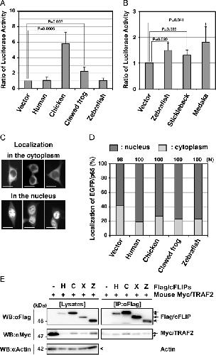 Fig. 5. Functional analyses of non-mammalian c-FLIP proteins on NF-κB activation ability. (A, B) Enzymatic analysis of NF-κB activation induced by non-mammalian c-FLIP proteins. The empty vector or plasmids carrying c-FLIP were transiently co-transfected with pNFκB-Luc and pRL-TK into HEK293 cells, and cultured for 48 h. NF-κB activation was analyzed by measuring enzyme activities of dual luciferases produced in transfected cells using a luminometer. Data are presented as the means and standard deviations of samples counted from three independent experiments. The statistically-significant difference between two groups was evaluated by Studentâs t-test. (C) Cytological analysis of a NF-κB component, p65, in cells expressing c-FLIP. HEK293 cells were transiently transfected with an empty vector or plasmids carrying c-FLIP together with pEGFP/p65, and cultured for 24 h. The localization of EGFP/p65 proteins in transfected cells was analyzed by fluorescence microscopy. Typical patterns of subcellular localization of EGFP/p65: EGFP/p65 normally localizes in the cytoplasm (upper panels), but it translocates into the nucleus when the NF-κB signaling pathway undergoes activation (lower panels) [35]. Scale bars indicate 20 μm. (D) A summary of cytological analyses on the translocation of EGFP/p65. Within each field, positive cells (dark gray) and negative cells (light gray) for EGFP/p65 translocation were counted under the fluorescent microscope and percentages of total were calculated. N indicates the total number of transfected cells examined in four independent experiments. (E) Co-immunoprecipitation and immunoblot analysis of physical interactions between non-mammalian c-FLIP proteins and mouse TRAF2. HEK293 cells were transfected with either pCMV-Flag/HsFLIP, pME18S-Flag/GgFLIP, pME18S-Flag/XlFLIP, pME18S-Flag/DrFLIP, or control vector in combination with pME18S-Myc/TRAF2. Forty-eight hours after transfection, cells were lysed and the c-FLIP complex was immunoprecipitated from whole cell lysates with an anti-Flag antibody. Samples were analyzed alongside aliquots of the cell lysates by immunoblotting with anti-Flag, anti-Myc, and anti-actin antibodies, respectively. An asterisk indicates immunoglobulin light-chain. Abbreviations: H, human; C, chicken; F, clawed frog; Z, zebrafish; IP, immunoprecipitation; WB, western immunoblotting. |