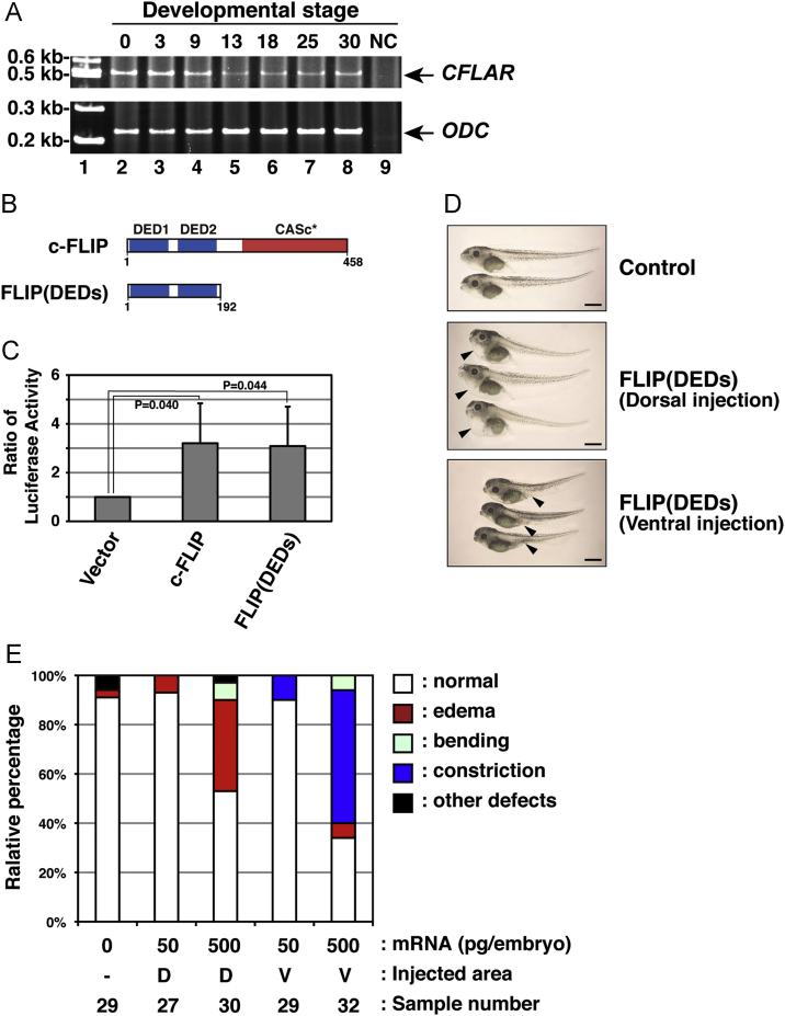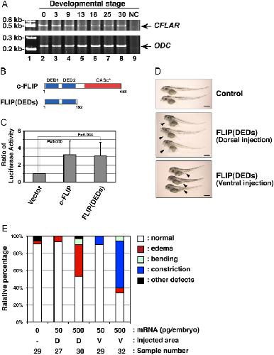 Fig. 6. Irregular development of X. laevis embryos expressing a c-FLIP mutant. (A) The expression profile of African clawed frog CFLAR transcripts during embryogenesis. Total RNAs isolated from X. laevis embryos, which were collected at indicated stages (lanes 2â8), was analyzed by RT-PCR. PCR products amplified with primers specific for CFLAR (upper panel) and ODC (lower panel) were resolved by acrylamide-gel electrophoresis. Molecular weight markers were run in lane 1, and a negative control (NC) with no polymerase was run in lane 9. Arrows indicate the expected molecular weights of the CFLAR and ODC PCR products, respectively. (B) The structure of a truncated c-FLIP mutant, FLIP(DEDs), consisting of only two DED motifs. (C) Effect of a FLIP(DEDs) mutant on NF-κB activation. The empty vector or plasmids encoding intact or truncated forms of clawed frog c-FLIP were transiently co-transfected with pNFκB-Luc and pRL-TK into HEK293 cells. After 48 h in cell culture, NF-κB activation was analyzed by measuring enzyme activities of dual luciferases produced in transfected cells using a luminometer. Data are presented as the means and standard deviations of samples counted from three independent experiments. The statistically-significant difference between two groups was evaluated by Studentâs t-test. (D) Morphological analysis of embryos expressing FLIP(DEDs). X. laevis embryos were injected without (upper panel) or with mRNA encoding FLIP(DEDs), at the equatorial area of two dorsal (middle panel) or two ventral (lower panel) blastomeres at the four-cell-stage. Images of the developing embryos were acquired at stage 45. Arrowheads indicate the edema and abdominal constriction of the injected embryos, respectively. Scale bars indicate 1 mm. (E) A summary of the phenotypic data presented in (D). Embryos displaying edema (red), abdominal constriction (dark blue), bending (light blue), and other defects (black) were counted under the microscope. Data represent the percentages calculated from five independent experiments. Abbreviations: D, dorsal; V, ventral. |