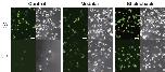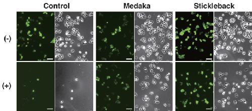 Fig. A2. Cytological analysis of transfectants expressing fish c-FLIP proteins. HeLa cells expressing Venus with or without medaka and stickleback c-FLIP proteins were incubated in the presence (lower panels) or absence (upper panels) of anti-Fas antibody and CHX for 8 h, and examined for viability by monitoring Venus-positive cells. Both fluorescence and phase-contrast images in the same field were captured under the microscope. Scale bars represent 100 μm. |
